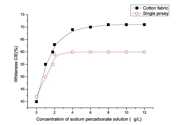 Dari gambar di ketahui bahwa semakin tinggi konsentrasi Oxy yang di gunakan untuk memutihkan pakaian, tidak memiliki pengaruh yang signifikan. Konsentrasi yang ideal adalah menggunakan oxy pada konsentrasi 6 gram/liter selama 60 menit akan memberikan dampak maksimal. Penambahan konsentrasi lebih dari 6 gram/liter tidak memberikan pengaruh terhadap keputihan pakaian. Pada kondisi tersebut, pakaian dari katun lebih putih dibanding bahan dari Jersey.