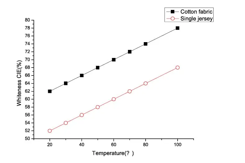 Dari gambar di ketahui bahwa semakin tinggi suhu yag di gunakan akan semakin putih pakaian. Bahan dari katun akan lebih putih di banding pakaian dari bahan Jersey. Pada suhu air mendidih (100 oC) Oxy dapat memutihkan pakaian sampai dengan 78% dari kondisi awalnya. Kondisi yang paling sesuai adalah menggunakan suhu 80 oC selama 60 menit.
