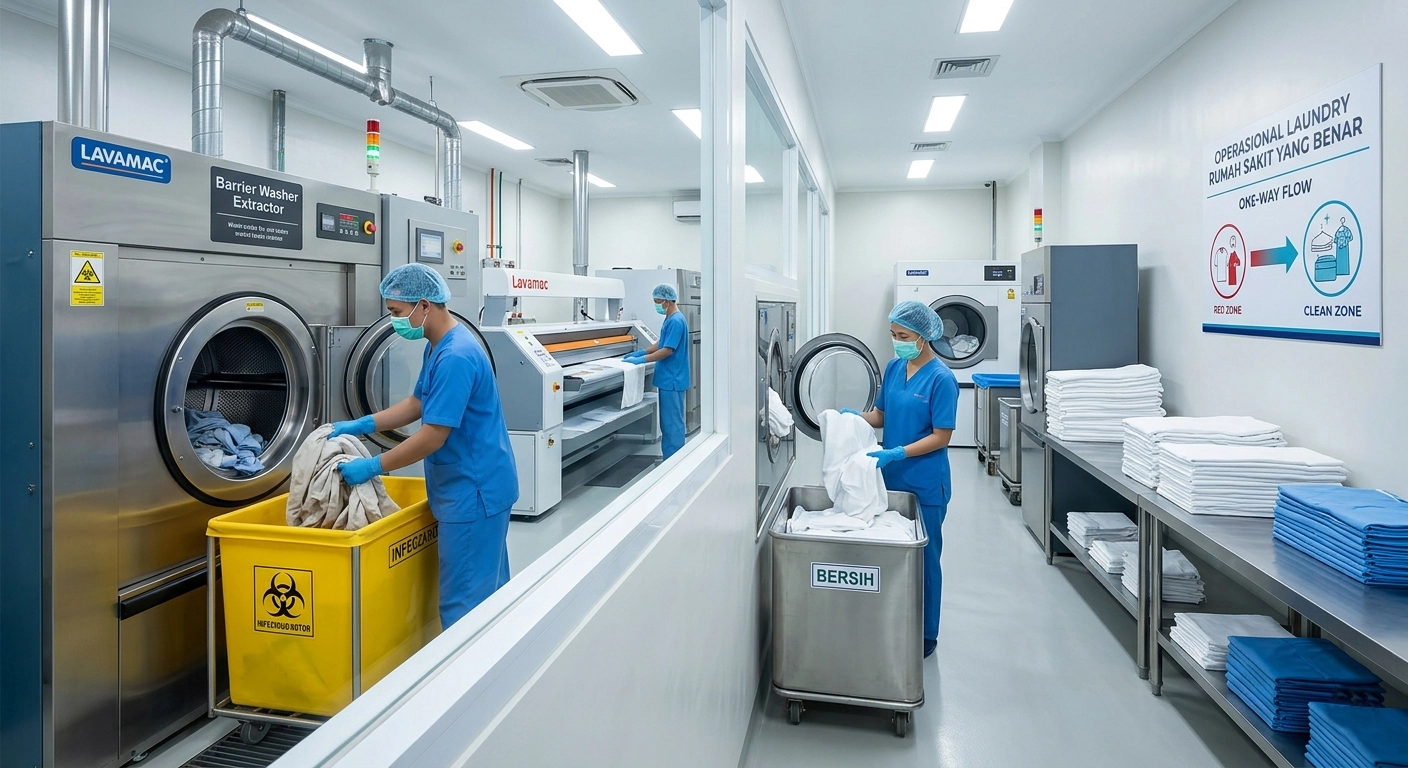 Standar emas laundry rumah sakit adalah penggunaan Barrier Washer Extractor. Mesin ini memiliki dua pintu, yaitu Pintu masuk (sisi kotor) untuk memasukkan linen infeksius dan Pintu keluar (sisi bersih) untuk mengeluarkan linen yang sudah selesai di cuci.